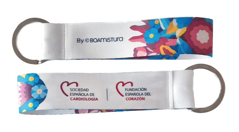 Llavero de cinta textil con anilla metálica.