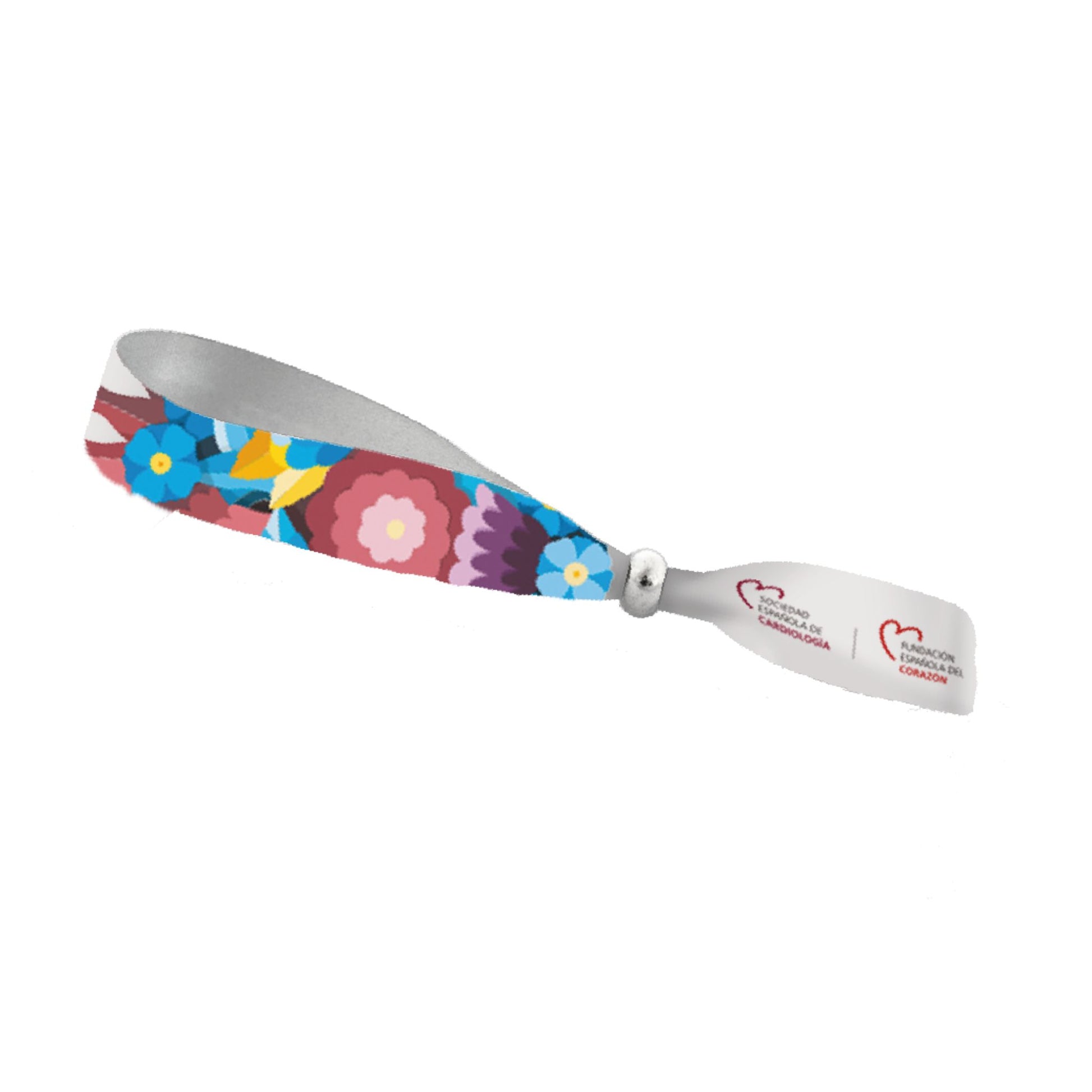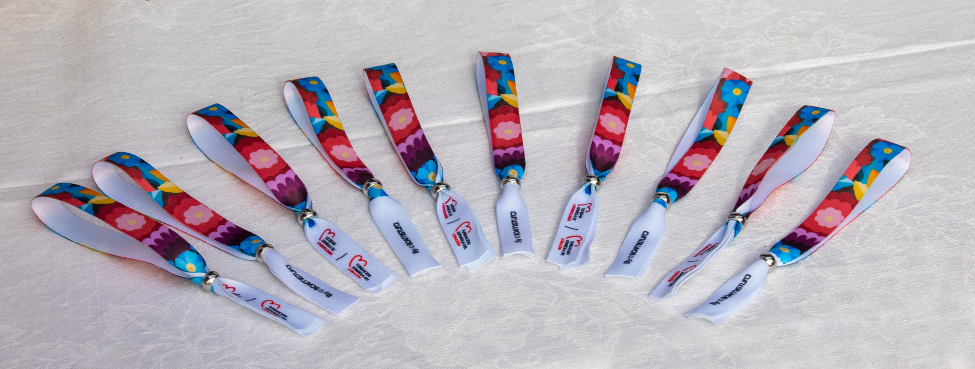 Pulsera textil ajustable con bola metálica corredera y reverso blanco.
